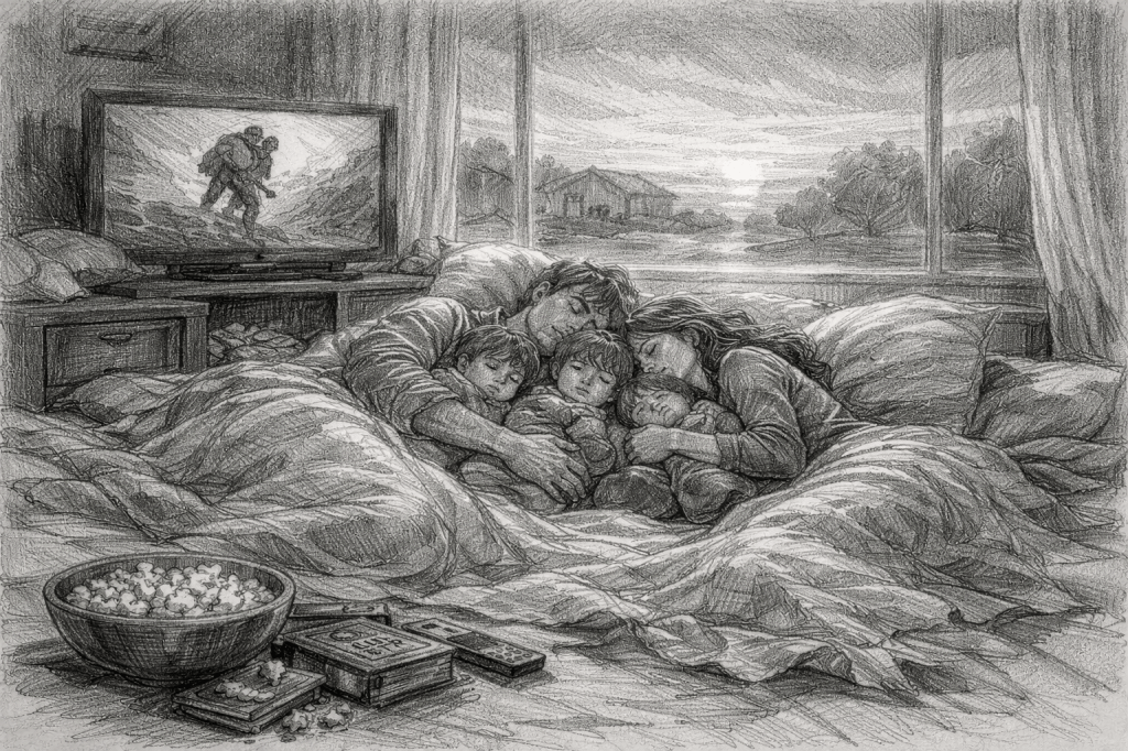 They built a nest of blankets on the living room floor. Popcorn, though none of them were very hungry. The curtains left open so the fading afternoon light could mingle with the glow of the television.